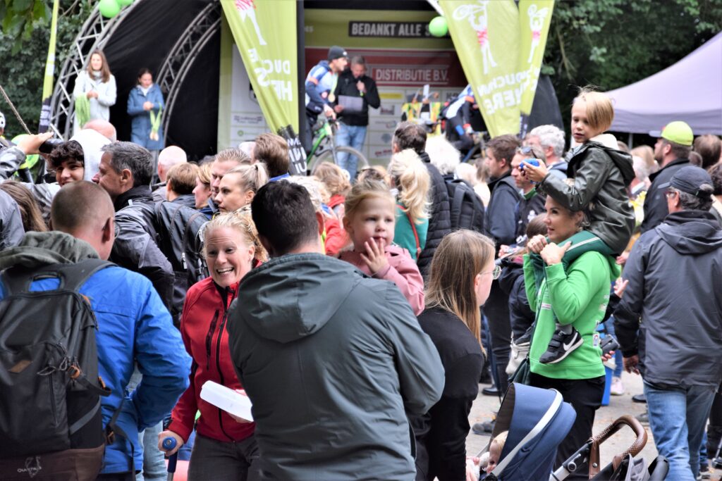 Und was für eine Leistung sie ablieferten. Mit sieben Radfahrern und zwei Führern sammelte das Team an drei Tagen, an denen es hauptsächlich mit Mountainbikes durch den Schlamm fuhr, mehr Geld als die selbst gesetzte Zielsumme. Und obendrein erzielten diese Giganten auch noch einen Rekord an Reifenpannen für ein Fahrrad an einem Tag. Teammitglied Sjaak lief daher am zweiten Tag die letzte Strecke bis zum Ziel und wurde dafür als Held in Socken ausgezeichnet. Es muss sich wie ein warmes Bad angefühlt haben, dass die Zuschauer in großer Zahl am Drielandenpunt in Vaals anwesend waren, um die klatschnassen Mountainbiker über die Ziellinie fahren zu sehen.