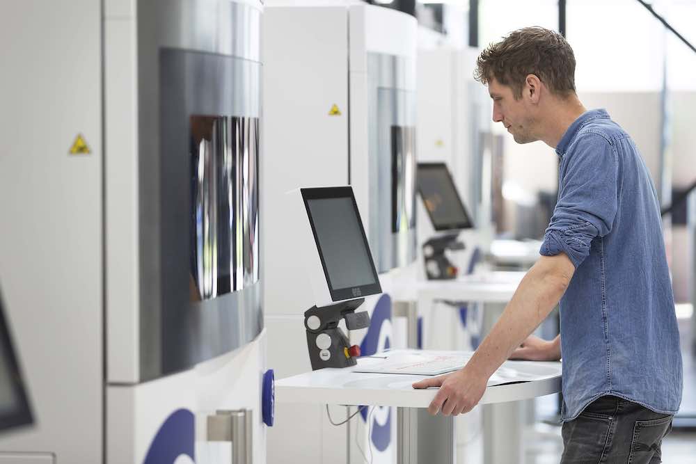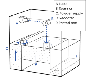 A so-called recoater deposits a thin layer of powder on the building platform. This layer is heated, and a laser melts a thin slice of the product in this layer. This process is repeated until all slices of the product have been melted.