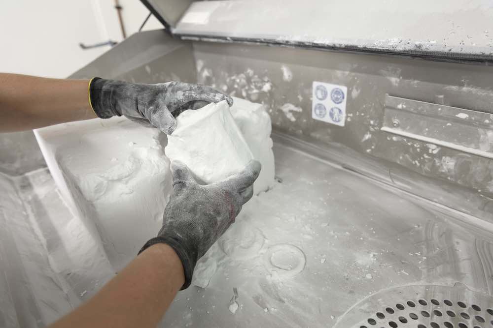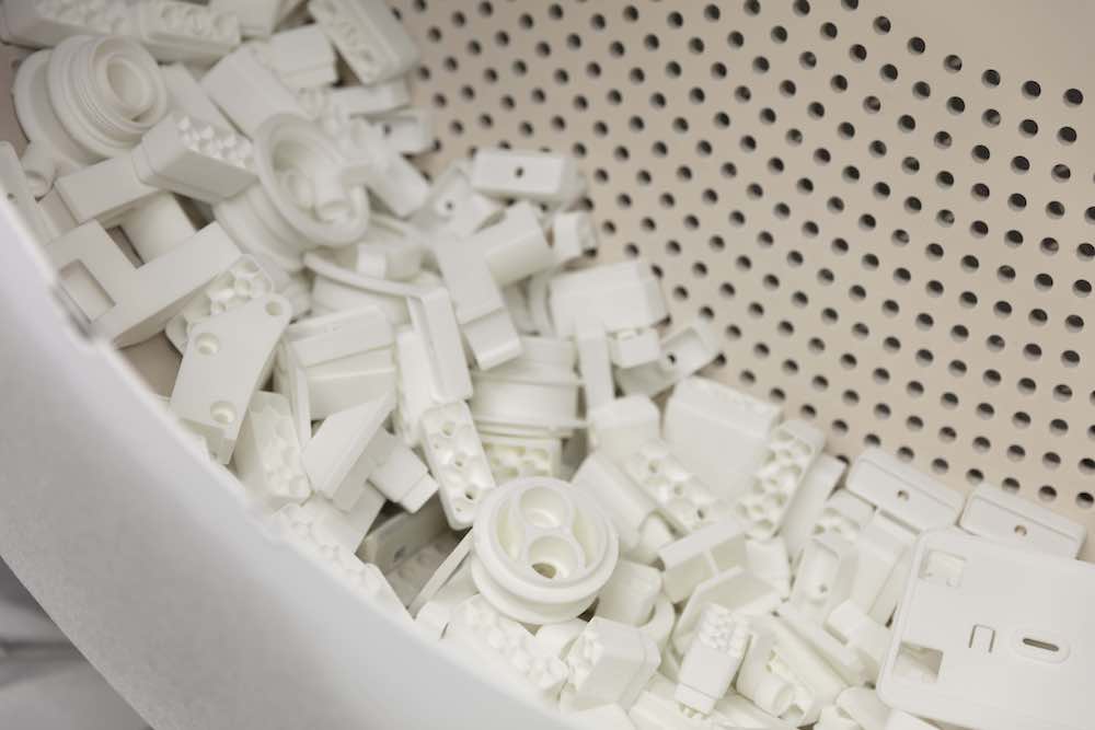 After cooling, the powder cake is unpacked manually to retrieve all the individual parts. The excess powder is collected and rerouted back into the process. The ability to directly reuse the surplus material makes SLS printing one of the most efficient manufacturing methods.