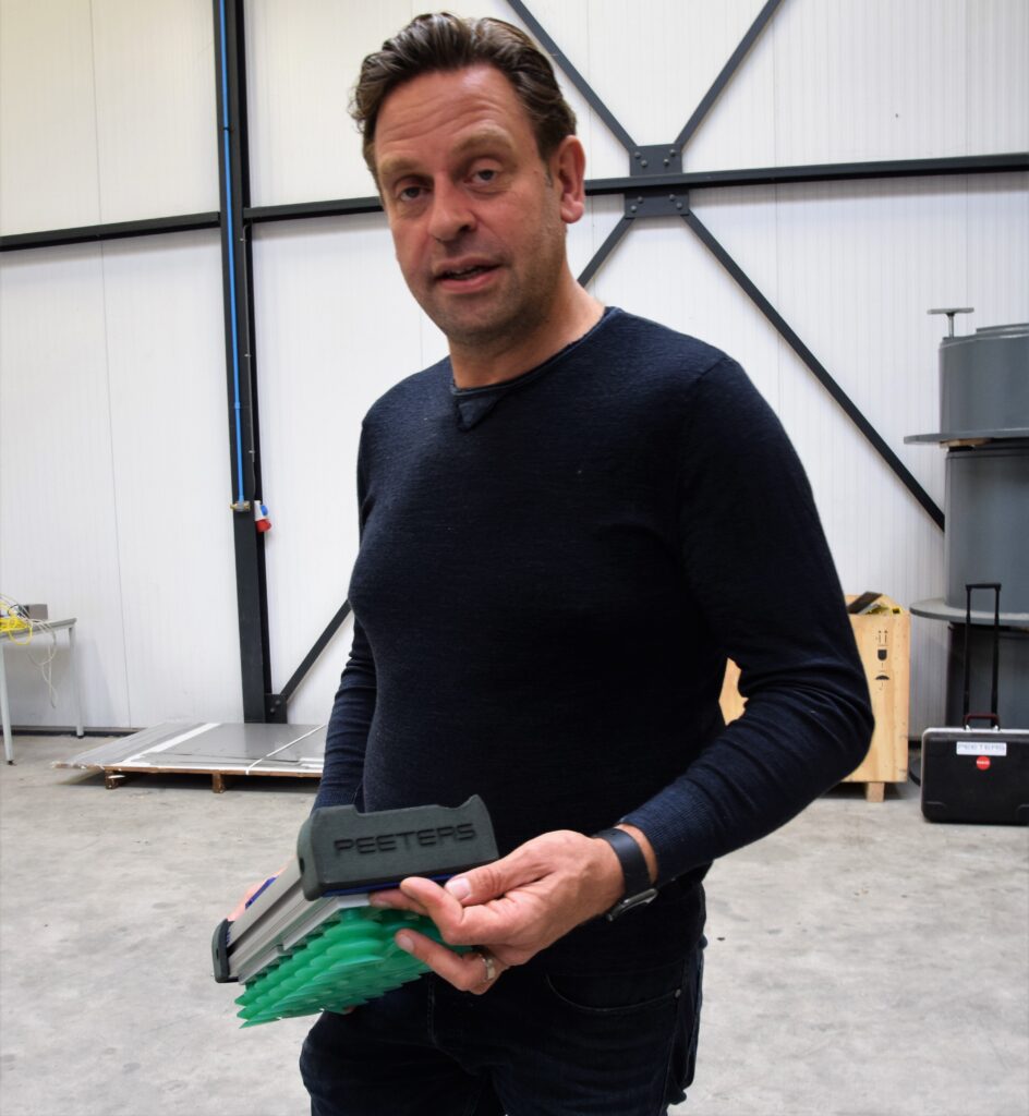 Die pragmatische instelling vindt Peeters ook bij Parts On Demand. “Het blijkt dat Parts On Demand echt wel de partij is als het gaat om het 3D-printen van kwalitatief hoogstaande producten. We waren ooit bij een andere partij belandt, die ons voor het betere werk ook naar Parts On Demand verwees. Bovendien is het gevoel goed, ze denken ook echt actief mee, net zoals we dat zelf graag doen met onze klanten. We betrekken al onze medewerkers bij de gesprekken, want het is belangrijk dat iedereen de mogelijkheden kent. We hebben zelf ook een 3D-printer staan, met kunststof draad, maar dat is echt wel andere koek. Die gebruiken we puur om vormen te testen, maar als het stevig moet, dan bestellen we het bij Parts On Demand. Laatst heb ik ook een klant naar hen verwezen, omdat ze gewoon goed werk leveren.” In de werkplaats laat hij een gripper zien van een robot. “Kijk, dit is zo niet geschikt om toe te passen op een cobot. De hoeken zijn te scherp en daar kan iemand zich aan verwonden.” Hij plaats er zachte afgeronde kappen op, die ook nog eens voorzien zijn van het Peeters logo. “Met deze afgeronde kappen van zachte flexibele kunststof kan deze gripper dus ook op een cobot worden gebruikt.”